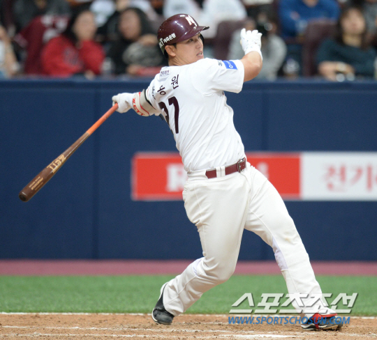 박동원은 20일 대전 한화생명 이글스파크에서 열린 한화 이글스와의 원정경기에 9번 포수로 선발 출전해 0-1로 뒤지던 3회초 1사 후 동점 솔로포를 터트렸다. 한화 선발투수 배영수를 상대로 볼카운트 1B2S에서 4구째 포크볼(시속 126㎞)를 퍼올려 좌측 담장을 넘어가는 라인드라이브성 홈런(비거리 110m)을 날린 것.