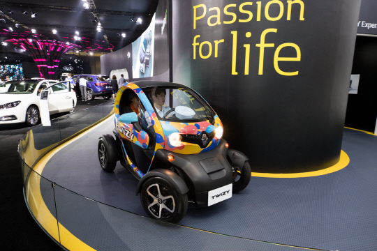 8일부터 17일까지 부산 벡스코에서 열리는 '2018 부산모터쇼'에서 르노삼성자동차가 전시관 내에 약 100m 길이의 초소형 전기차 트위지 주행트랙을 설치해 어린이 방문객들이 즉석에서 동승 시승할 수 있는 기회를 상시 제공하고 있다.