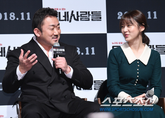 또한 많은 여고생 엑스트라 배우들과 촬영하면서 인상적인 에피소드에 대해서도 이야기 해 눈길을 끌었다. 그는 "200여명의 일반 학생들이 촬영을 위해 많이 오셨다. 조감독이 200명을 통제하려니 어렵고 연기도 그친구들이 해줘야 해서 중간중간 그 친구들과 이야기도 많이 나누고 노력했다"고 입을 열었다. 이어 그는 "그 친구는 연기를 하는 배우 친구다. 그 친구가 서있는 저와 부딪히면서 살짝 넘어지는 장면이 있었는데 그 친구가 뛰면서 슬쩍 보고 부딪혀야 하는데 저를 안보고 오다가 리얼로 정말 세게 부딪혀서 정말 공중에 떴다"며 "살짝 까져서 촬영을 중단하고 응급처치 하고 병원도 다녀왔다. 다행히 아무 이상 없었다. 실제로 세게 부딪혀서 마음이 안좋았다"고 설명했다. 또한 마동석과 김새론은 '이웃사람'에 이어 다시 재화하게 된 소감도 전했다. 김새론은 "'이웃사람'에서 직접적으로 연기하는 장면이 많지 않았는데 이번에는 처음부터 끝까지 즐겁게 촬영했다"고 말했다. 이어 마동석은 "일단 풀쩍 큰 키에 놀랐다. '이웃사람' 때도 연기할 때는 카메라 앞 집중력이 어마어마 했다. 그걸 알고 있어서 붙는 신들이 많으니까 즐겁게 촬영해보자는 생각을 했다. 현장 분위기도 정말 좋았다"고 만족했다.