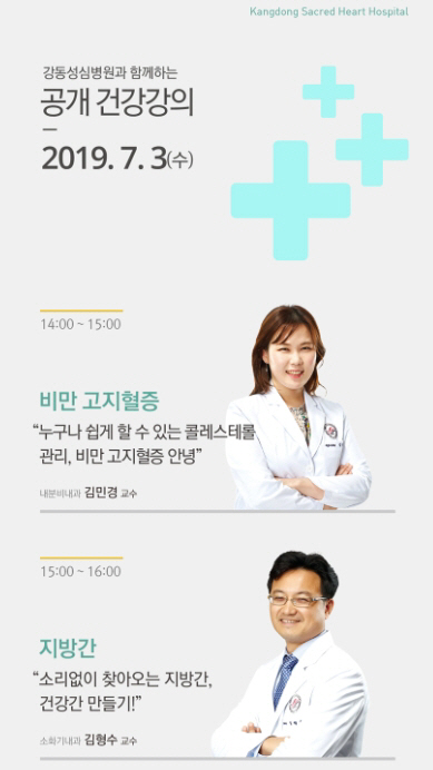이번 강좌는 우리나라 3대 성인병인 비만에 대한 올바른 인식과 예방법을 제공하는 '비만 합병증 드림팀' 캠페인의 일환이며 ▲내분비내과 김민경 교수의 '누구나 쉽게 할 수 있는 콜레스테롤 관리, 비만 고지혈증 안녕' ▲소화기내과 김형수 교수의 '소리 없이 찾아오는 지방간, 건강 간 만들기!' 등으로 진행된다.
