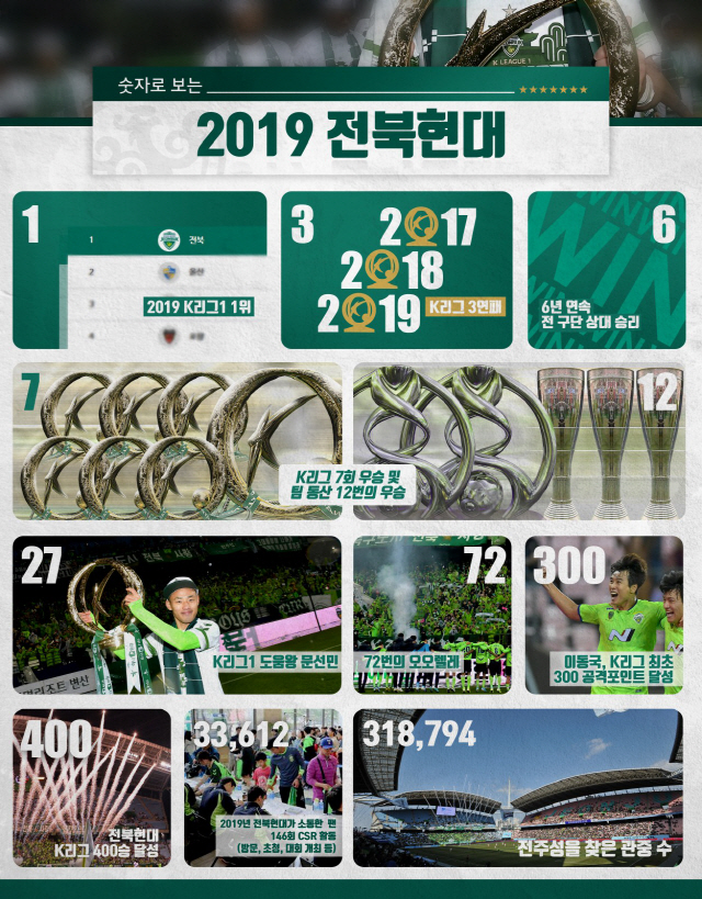 전북 현대는 2017년과 2018년에 이어 올해 또다시 왕좌에 올라 K리그 3연패의 위업을 달성했고, 전 구단 상대 승리 기록도 6년으로 늘렸다.