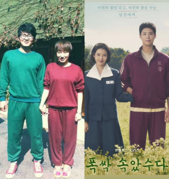 윤형빈은 29일 자신의 개인 계정에 "아니 이거 표절 아닌가요? 우리 연애 때 찍은 사진이랑 똑같은 포스터라니. 신기합니다. 박보검, 아이유vs바보검, 아이둘이유. 여보 우리도 하나 찍읍시다. 그때보다 폭삭 삭았수다로"라는 글을 남겼다.