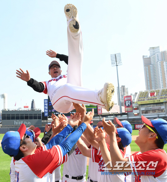 벽산-하츠, 스포츠조선이 주최하는 제2회 벽산-하츠 인비테이셔널 전국 사회인야구대회 결승전 아티스트와 누리TLC 의 경기가 16일 수원 KT위즈파크에서 열렸다. 아티스트를 12대 5로 누르고 우승을 차지한 누리TLC 선수들이 이준휘 감독을 헹가래 치고있다. 수원=최문영 기자 deer@sportschosun.com /2018.06.16/