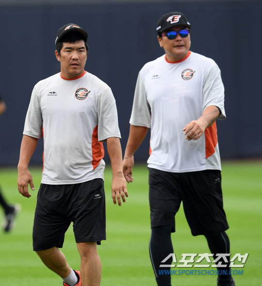 kt 위즈와 한화 이글스의 2018 KBO 리그 경기가 19일 수원 kt위즈파크에서 예정된 가운데 양팀 선수단이 훈련을 펼쳤다. 한화 송광민과 김태균이 워밍업을 위해 그라운드로 나서고 있다. 수원=허상욱 기자 wook@sportschosun.com/2018.07.19/