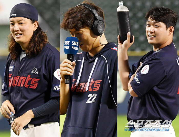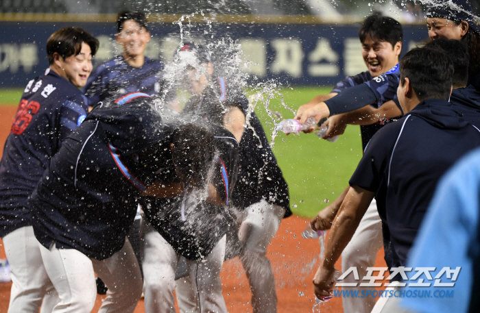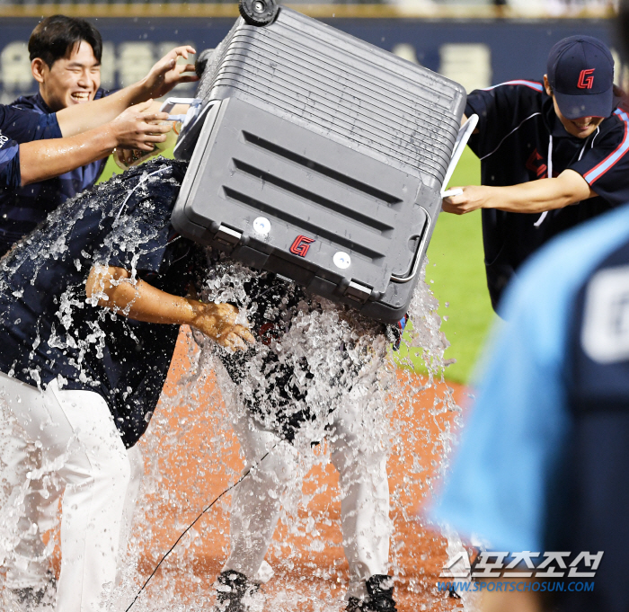 이들 중 가장 신나 보였던 김원중은 인터뷰하는 구승민 다리 밑으로 기어들어가 발에만 물을 뿌리며 마음의 준비를 하라고 예고했다. 인터뷰를 마친 구승민이 헤드셋을 빼는 순간 좌우 앞뒤 가리지 않고 물세례가 시작됐다.