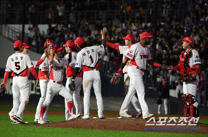 23일 광주 기아 챔피언스필드에서 열린 삼성과 KIA의 한국시리즈 2차전. KIA가 8대3으로 승리하며 1, 2차전을 모두 가져왔다. 선수들이 승리를 자축하고 있다. 광주=정재근 기자 cjg@sportschosun.com/2024.10.23/