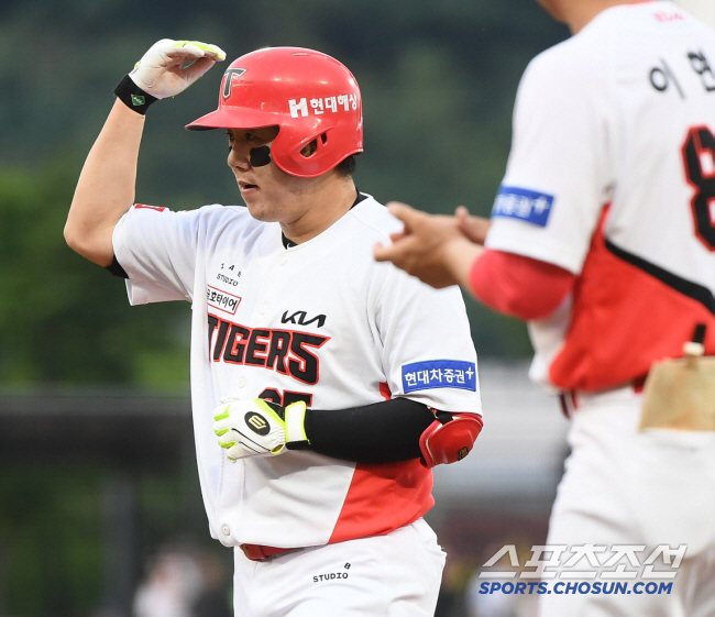 23일 광주 기아 챔피언스필드에서 열린 한화와 KIA의 DH2차전. 3회말 1사 1, 2루 이우성이 1타점 적시타를 친 후 기뻐하고 있다. 광주=정재근 기자 cjg@sportschosun.com/2024.6.23/