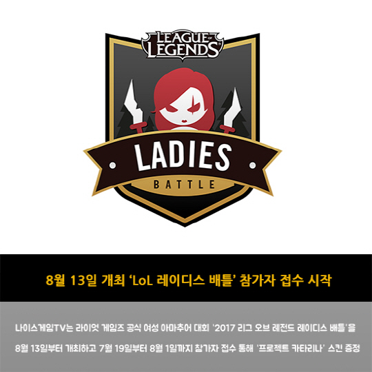 나이스게임TV는 라이엇 게임즈 공식 여성 아마추어 대회 '2017 리그 오브 레전드 레이디스 배틀'을 8월 13일부터 개최하고 7월 19일부터 8월 1일까지 참가자 접수 통해 '프로젝트 카타리나' 스킨 증정