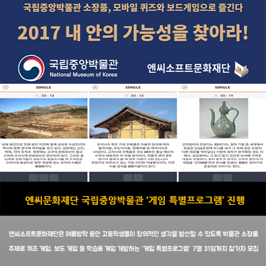 엔씨소프트문화재단은 여름방학 동안 고등학생들이 창의적인 생각을 발산할 수 있도록 박물관 소장품 주제로 퀴즈 게임, 보드 게임 등 학습용 게임 개발하는 '게임 특별프로그램' 7월 31일까지 참가자 모집
