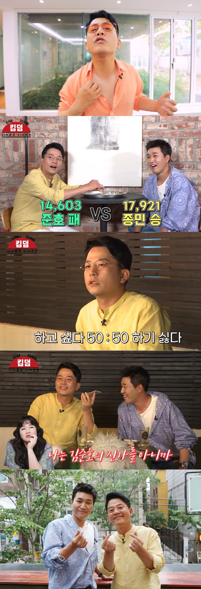김준호는 김종민과의 커버 댄스 경쟁에서 패배, 벌칙으로 깡소주를 마셔야 하는 리얼 음주 방송에 김준호는 "우리 진짜 성인방송이다"라고 말하며 감탄했다고. 이어 김준호는 김종민과 '취중토론 대결-돌아온 자 vs 안간 자'를 선보여 시청자들의 시선을 모았다. 특히 "나는 김준호가 재혼했으면 한다"를 주제로 찬반 토론이 벌어져 느닷없는 사적 토크가 이어졌다. 김준호는 "결혼을 하면 지금보다 행복할까?"라고 말문을 열며 '갔다 온 자'로서 솔직 대담한 토크를 이어가 이목을 집중시켰다.