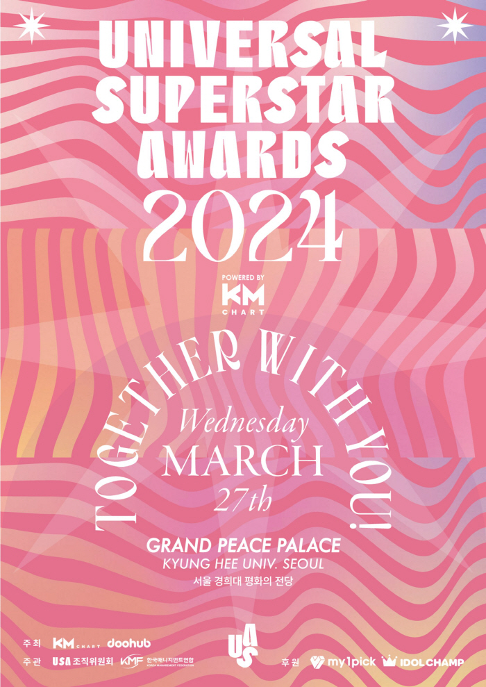 글로벌 스탠더드 K팝 차트 'KM차트'와 'doohub'가 주최하고 사단법인 한국매니지먼트연합이 주관하는 '2024 유니버설 슈퍼스타 어워즈(Universal Superstar Awards, 이하 '2024 USA')'가 오는 3월 27일 서울 경희대학교 평화의전당에서 개최된다.