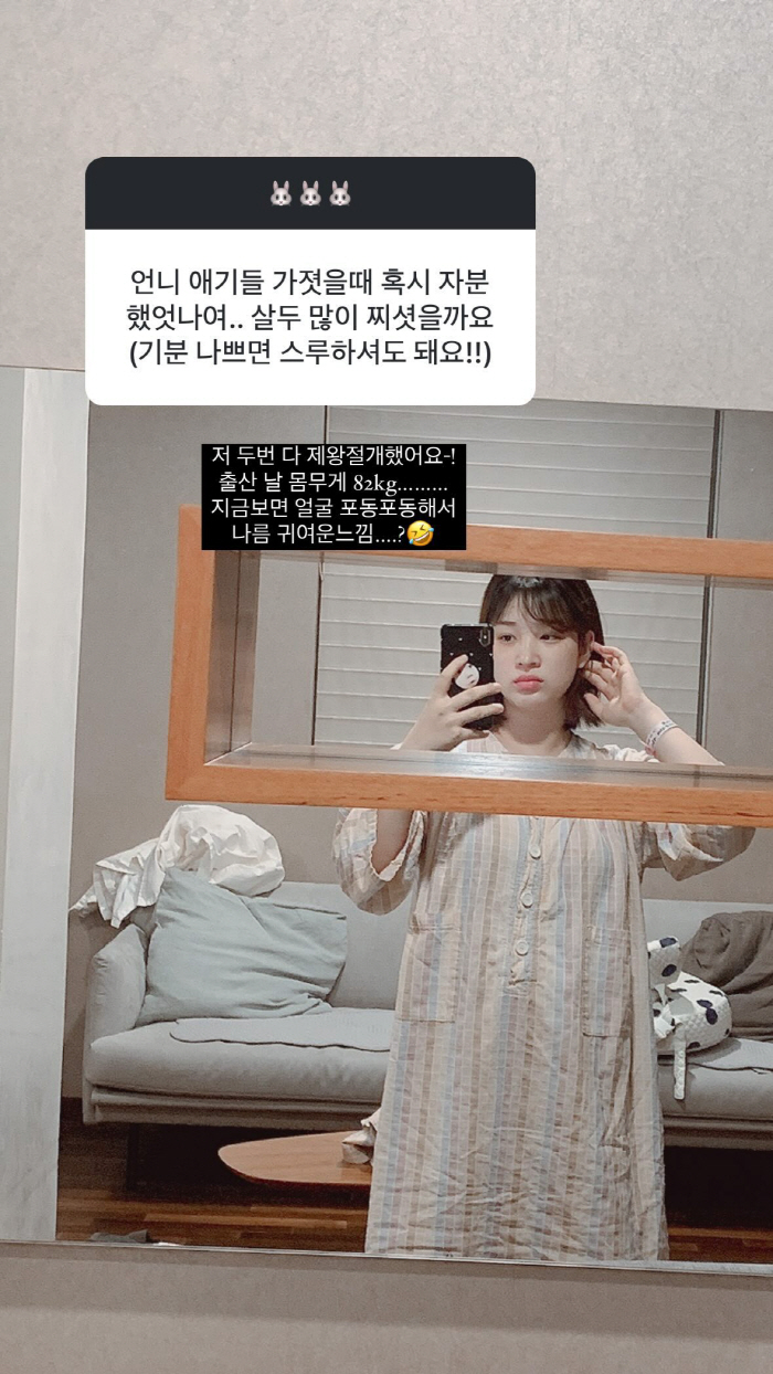 한 팬이 '애기들 가졌을 때 혹시 자분(자연분만)했냐. 살도 많이 쪘냐'고 묻자 율희는 "두 번 다 제왕절개 했다. 출산 날 82kg. 지금 보면 얼굴 포동포동해서 나름 귀여운 느낌?"이라며 임신 당시 찍은 사진을 공개했다.