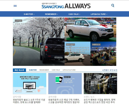 쌍용자동차가 공식 블로그 '쌍용 ALLWAYS' 오픈 1주년을 맞아 온라인 고객 편의성 제공 및 소통 강화를 위해 디자인 및 UI/UX를 전면 개편하고 이벤트를 실시한다고 3일 밝혔다.