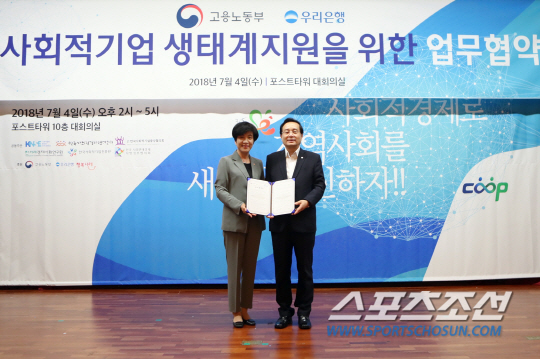우리은행은 지난 4일 서울 중구 포스트타워에서 김영주 고용노동부 장관과 손태승 우리은행장 등이 참석한 가운데 '사회적기업 생태계 지원을 위한 업무협약'을 체결했다고 밝혔다.