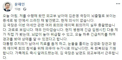 문 대통령은 또 "눈물을 흘리는 강경화 외교부 장관과 함께 에이펙 회의 참석을 위해 파푸아뉴기니로 떠납니다만 꼭 회복되길 기원한다"고 덧붙였다. <스포츠조선닷컴>