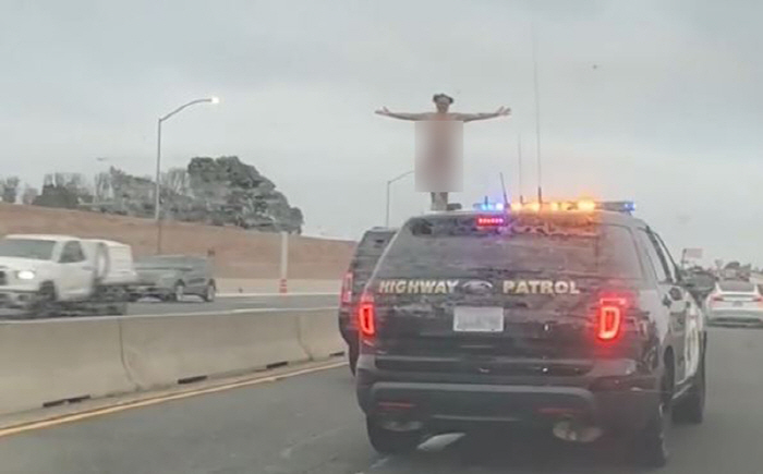 [스포츠조선 장종호 기자] 미국에서 경찰에 쫓기던 여성이 차량을 세우고 지붕에 올라가 옷을 모두 벗은 영상이 공개돼 화제다.