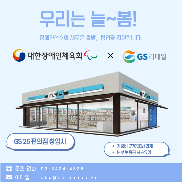 ○…대한장애인체육회와 GS리테일이 장애인 선수들의 창업을 지원하는 'GS25 늘봄창업지원제도'를 신설하고 참여자를 모집한다. '늘봄창업지원제도'란 GS25 편의점 창업을 희망하는 장애인 선수 및 은퇴선수를 대상으로 가맹비(약 770만원)를 면제해주고 본부 보증금의 최초 유예 혜택을 제공하는 제도다. 이러한 혜택을 통해 장애인 선수들의 창업 장벽을 낮추고 새로운 시작을 돕고자 한다. 현재 등록된 선수와 더불어 한 번이라도 대한장애인체육회에 선수등록을 한 적이 있으면 누구나 동일한 혜택을 받을 수 있다. 늘봄창업지원제도를 통해 창업을 희망하는 장애인 선수는 대한장애인체육회 체육육성부로 문의하면 된다.