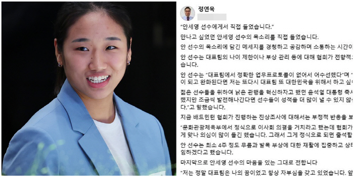 정 의원은 23일 자신의 SNS를 통해 "안세영 선수에게서 직접 들었습니다"는 글을 올렸다.