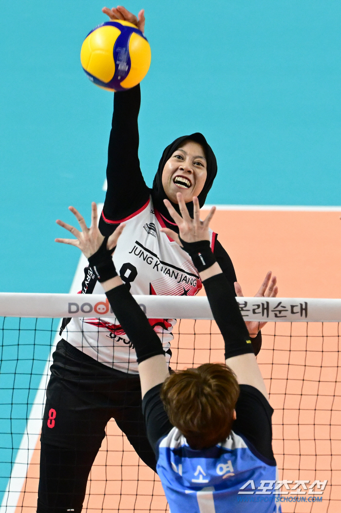 [통영=스포츠조선 권인하 기자]'이소영 더비'에서 정관장이 부키리치-메가의 쌍포가 폭발하며 첫 승을 챙겼다.