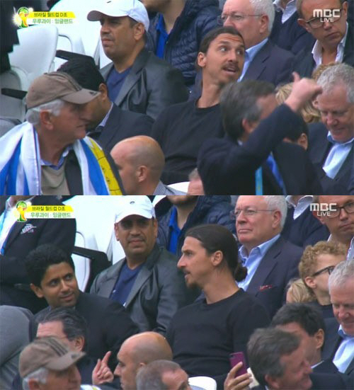 스웨덴의 세계적인 공격수 즐라탄 이브라히모비치(파리 생제르맹)가 브라질 월드컵 경기를 관전하고 있는 모습이 카메라에 포착됐다.