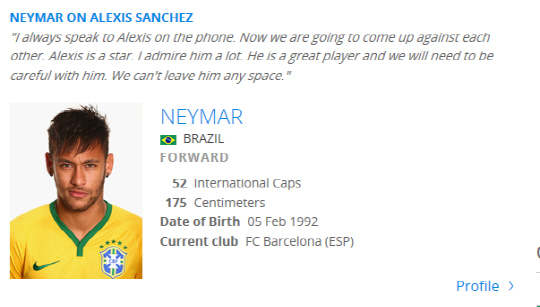 바르셀로나에서는 지난시즌 네이마르가 9골, 산체스가 19골을 기록했다. 그러나 브라질월드컵에서는 네이마르가 조별리그 3경기에서 4골로 득점선두, 산체스가 1골1도움을 기록중이다.