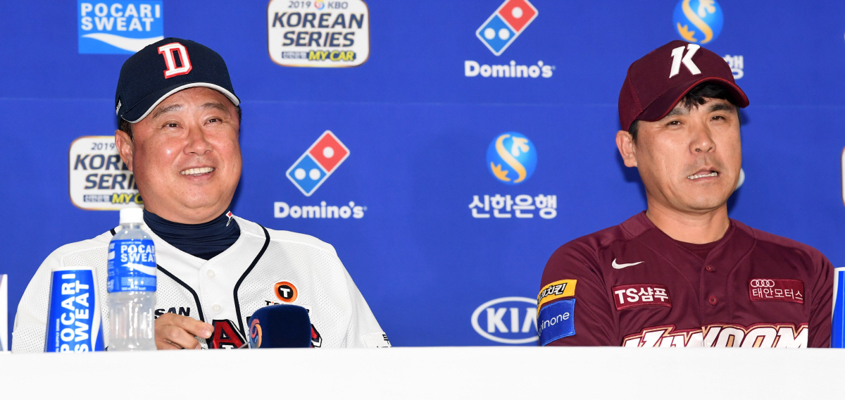 2019 한국시리즈 미디어데이가 21일 잠실구장에서 열렸다. 한국시리즈 미디어데이에는 정규시즌 1위인 두산 베어스 김태형 감독과 오재일, 이영하, 한국시리즈에 진출한 키움 히어로즈 장정석 감독과 이지영, 이정후가 참석했다. 미소를 짓는 김태형 감독과 장정석 감독의 모습. 잠실=허상욱 기자 wook@sportschosun.com/2019.10.21/