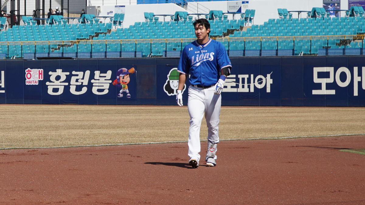 김동엽은 25일 대구 라이온즈파크에서 열린 청백전에서 홈런 포함, 4타수3안타 1타점 2득점으로 맹활약 했다. 7회까지 진행된 경기는 4대4 무승부로 끝났다.