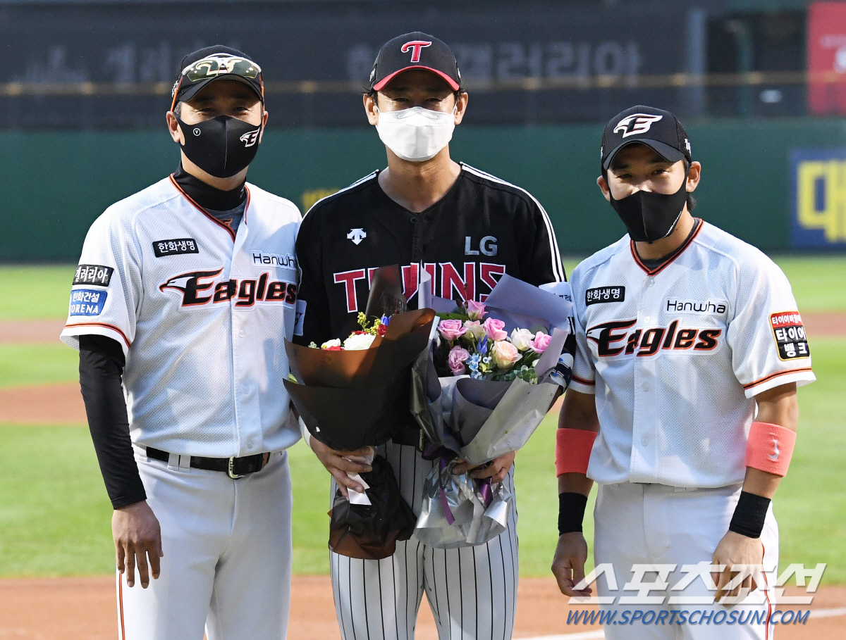 최원호 한화 감독 대행과 주장 이용규가 직접 꽃다발을 전했다. 박용택은 이용규와 따뜻한 포옹을 나눴다. 양팀 선수단 모두가 박용택을 중심으로 다정하게 기념 사진을 촬영했다.