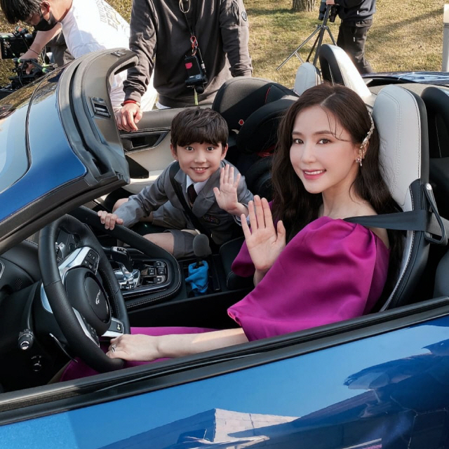 사진 속에는 극중 자신의 아들로 나오는 아역과 함께 오픈카를 타고 인증샷을 남기는 모습. 특히 공현주는 보라색 원피스를 입고 청담동 며느리룩을 완성시켰다.