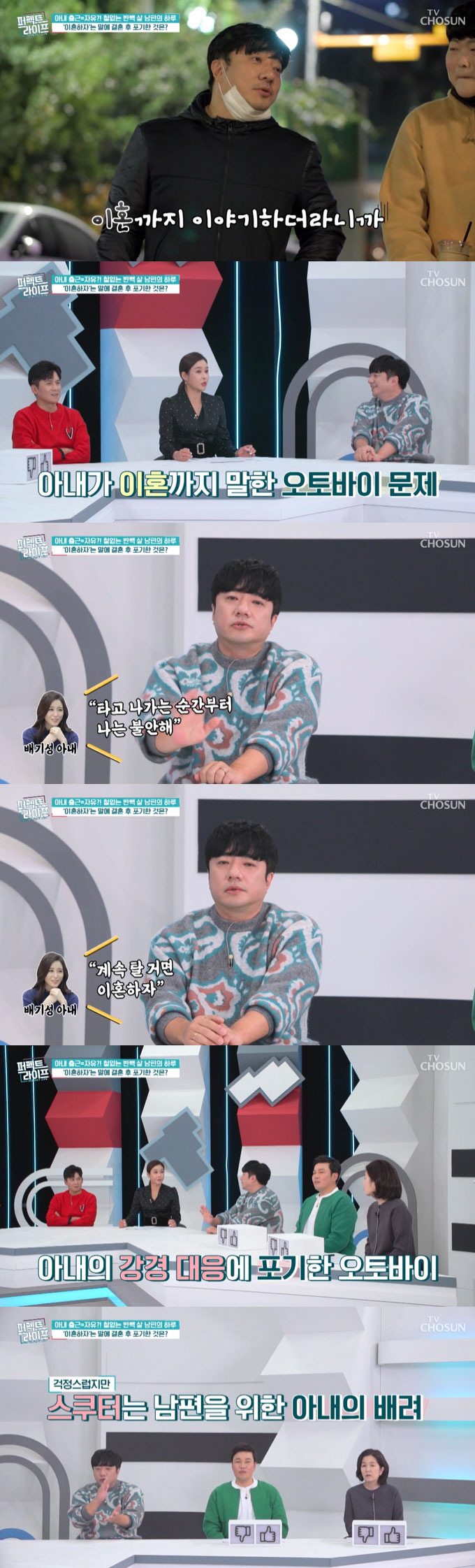 이를 스튜디오에서 지켜본 현영은 배기성에게 "아내 분이 바이크 때문에 이혼 얘기까지 했다면서요?"라고 물었고 배기성은 "이은비가 '바이크를 타고 나가는 순간부터 나는 불안하다. 잠도 못 잔다. 그러니까 계속 탈거면 이혼하자'고 하더라. 그래서 내가 '알았다. 안타고 안사겠다'라고 바이크를 포기했다"고 말했다.