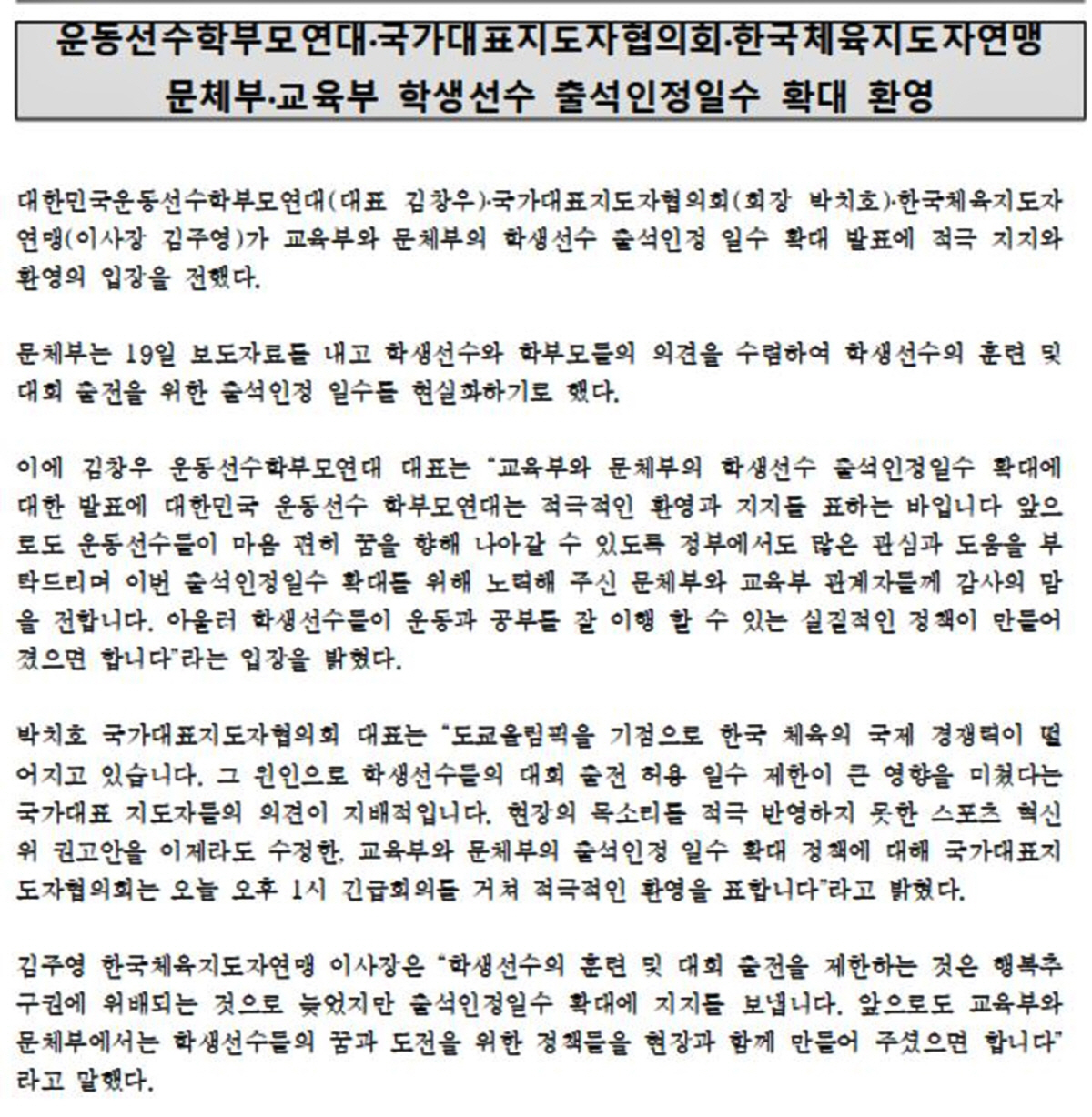 대한민국운동선수학부모연대(대표 김창우), 국가대표지도자협의회(회장 박치호), 한국체육지도자연맹(이사장 김주영)가 교육부와 문체부의 학생선수 출석인정일수 확대 발표에 적극 지지와 환영의 입장을 전했다.