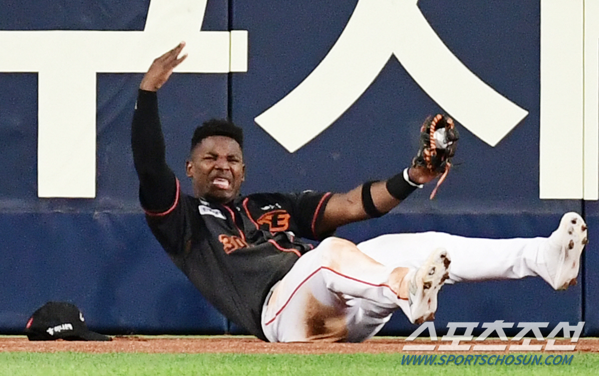 31일 대구 삼성라이온즈파크에서 열린 삼성과 한화의 경기. 6회말 삼성 양우현의 타구를 잡고 펜스와 충돌하며 부상을 당한 한화 페라자. 대구=송정헌 기자songs@sportschosun.com/2024.05.31/