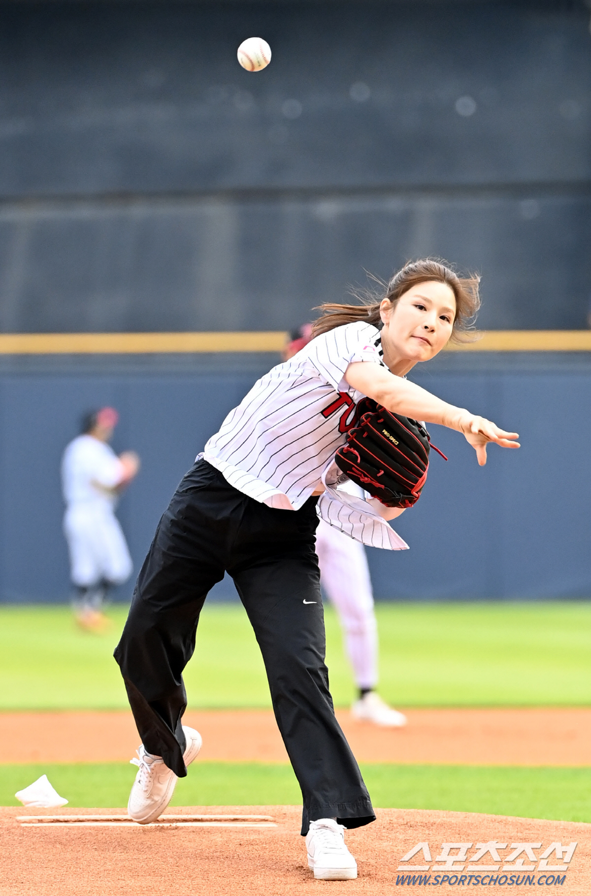 14일 잠실야구장에서 열린 롯데와 LG의 경기, '피지컬:100 시즌2'의 전 핸드볼 선수 박하얀이 시구, 우승자 아모띠가 시타를 맡았다. 힘차게 공을 던지는 박하얀의 모습. 잠실=허상욱 기자wook@sportschosun.com/2024.06.14/