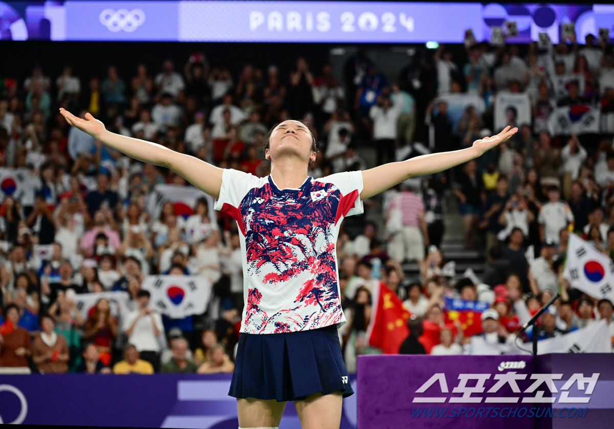 안세영이 5일(한국시각) 프랑스 파리 포르트드라샤펠 경기장에서 열린 파리올림픽 배드민턴 여자 단식 결승전에서 중국 허빙자오와 맞붙어 승리해 금메달을 땄다. 안세영이 세리머니를 펼치고 있다. 파리(프랑스)=정재근 기자 cjg@sportschosun.com/2024.8.5/