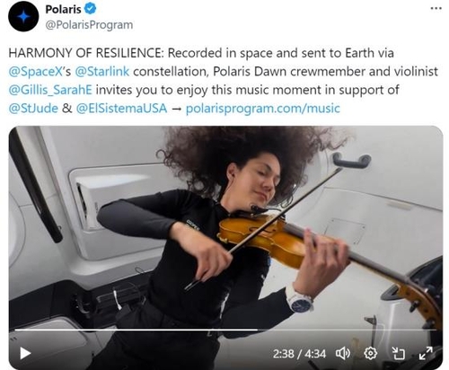 이 영상에는 현재 우주 비행 임무를 수행 중인 폴라리스 던 팀원 세라 길리스가 우주선 내에서 살짝 떠 있는 상태로 바이올린을 연주하는 모습이 담겼다.