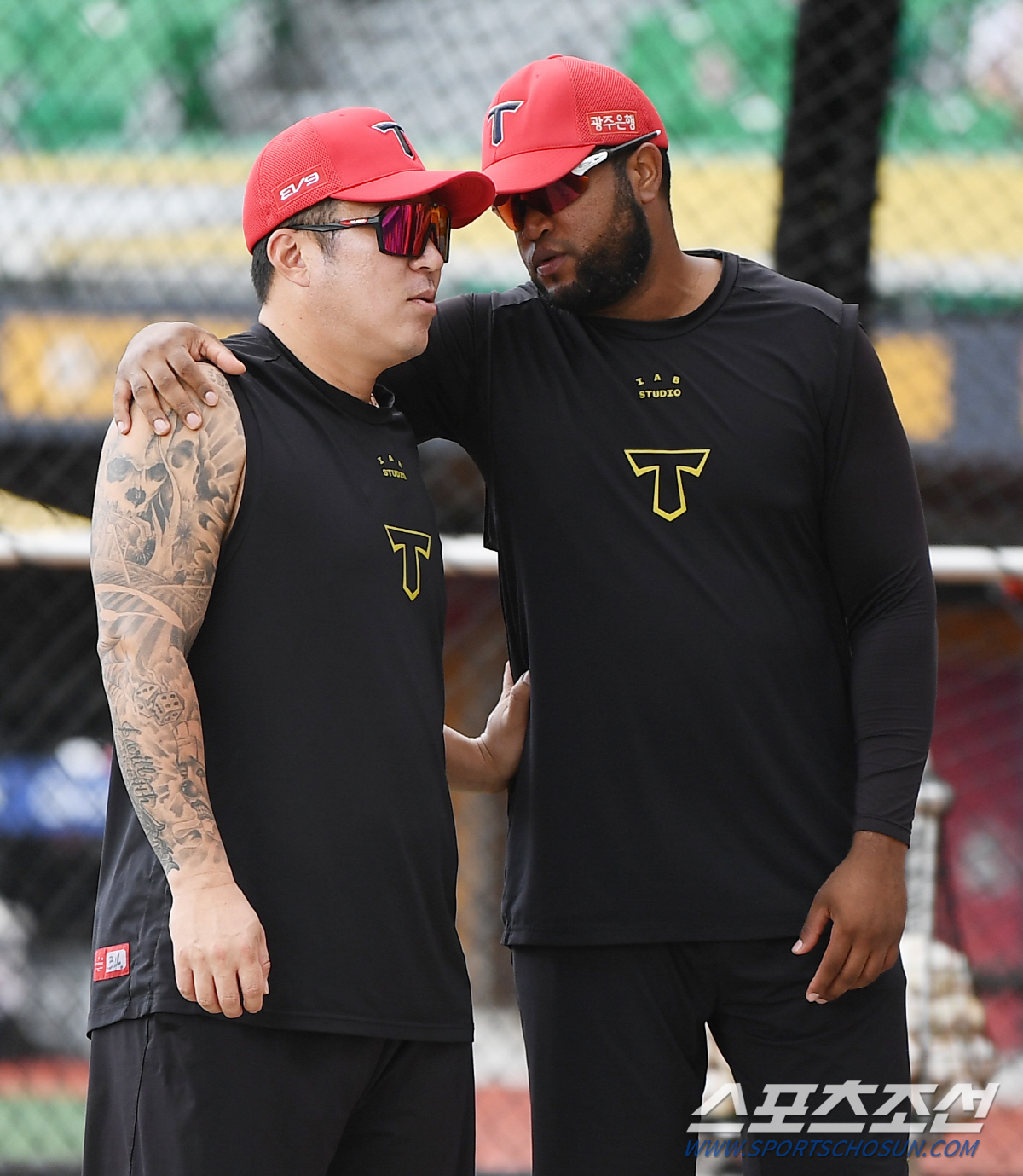 17일 인천 SSG랜더스필드에서 열린 KIA-SSG전. 경기 전 최형우와 소크라테스가 대화를 나누고 있다. 인천=정재근 기자 cjg@sportschosun.com/2024.9.17/