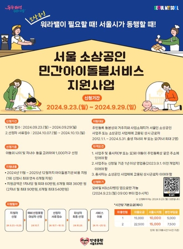 (서울=연합뉴스) 정수연 기자 = 서울시는 휴일이나 밤에도 일해야 하는 소상공인 사업주와 직원의 '아이돌봄서비스' 이용 비용을 지원한다고 18일 밝혔다.