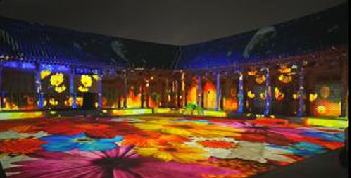 덕진공원 미디어콘텐츠는 건물 외벽 등 조형물을 3D 스캔한 다음 빔프로젝터로 영상을 투사하는 '프로젝션 맵핑'을 활용해 만들어졌다.
