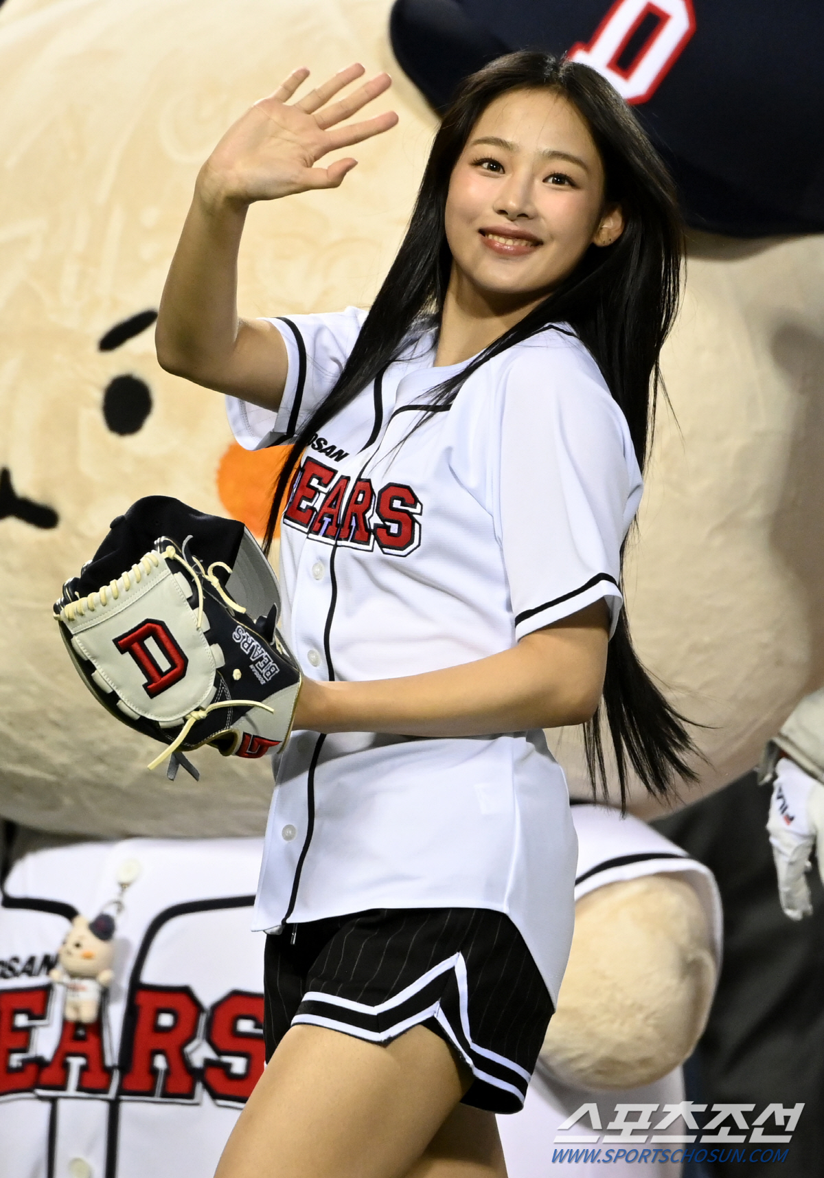 2일 잠실야구장에서 열린 KT와 두산의 와일드카드 1차전, 뉴진스 민지가 시구를 하고 있다. 잠실=허상욱 기자 wook@sportschosun.com/2024.10.02/