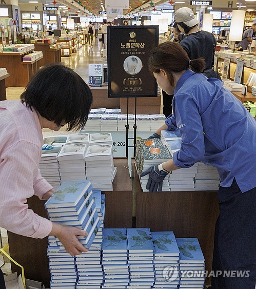 (서울=연합뉴스) 채새롬 기자 = 한강 작가의 노벨문학상 수상 이후 일주일간 온·오프라인 서점 매출이 40% 늘어난 것으로 나타났다. 매출 증가율이 가장 높은 연령대는 50·60대였다.
