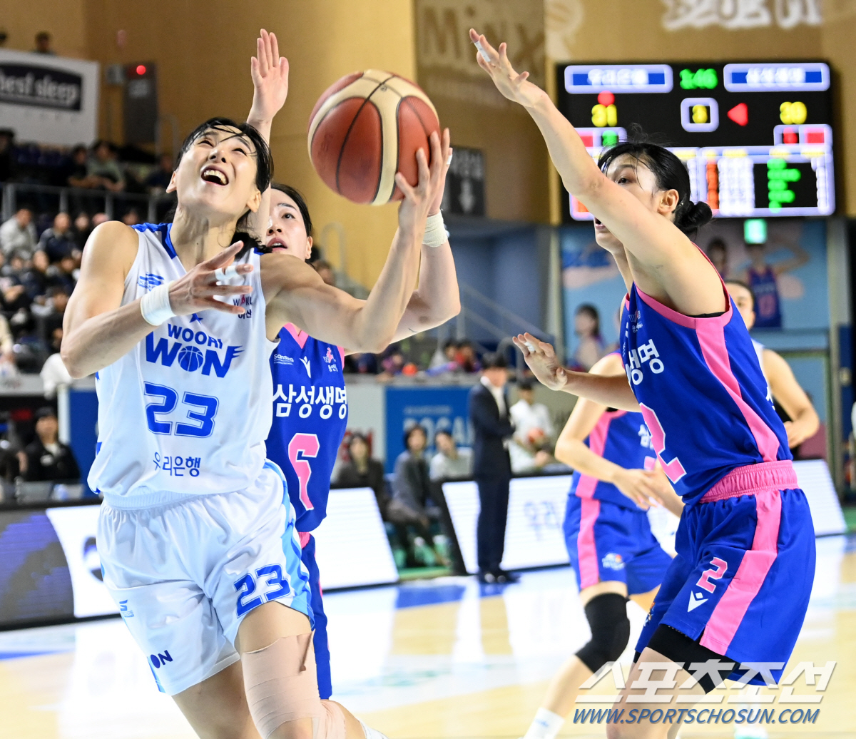 25일 용인실내체육관에서 열린 여자프로농구 삼성생명과 우리은행의 경기, 우리은행 김단비가 삼성생명 김아름(6번), 이해란의 수비를 피해 골밑슛을 시도하고 있다. 용인=허상욱 기자 wook@sportschosun.com/2024.11.25/