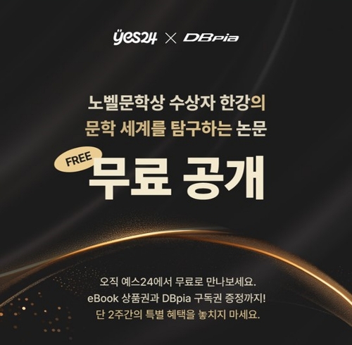 (서울=연합뉴스) 임순현 기자 = 온라인 서점 예스24와 학술 콘텐츠 플랫폼 디비피아는 오는 15일까지 한강 문학의 상징과 서사를 분석한 연구 논문 5편을 무료 공개한다고 6일 밝혔다.