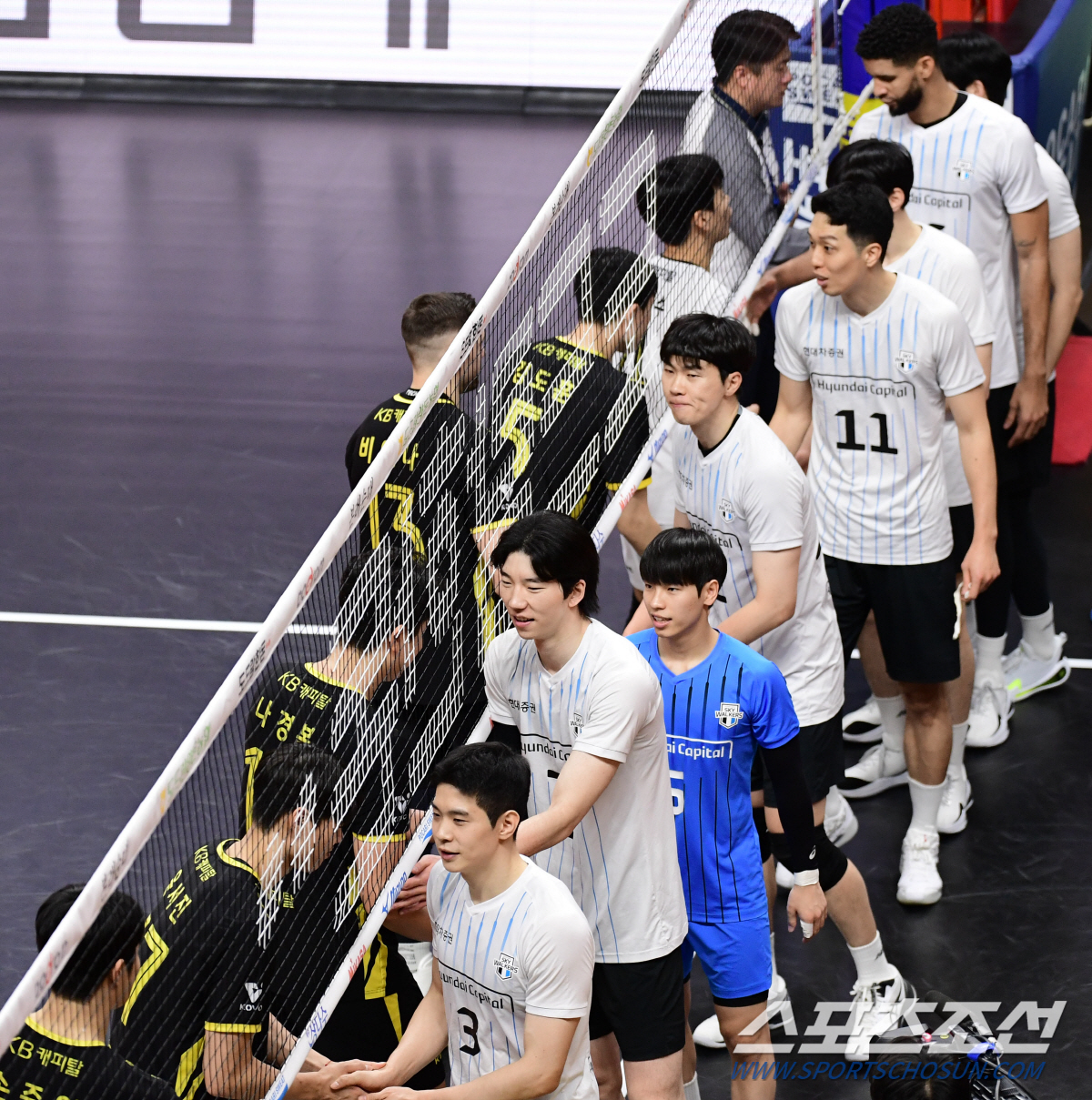 14일 안산 상록수체육관에서 배구 V리그 남자부 KB손해보험과 현대캐피탈의 경기가 열렸다. 현대캐피탈이 KB손해보험에 세트스코어 3대 0으로 승리했다. 경기 종료 후 인사를 나누고 있는 양 팀 선수들. 안산=송정헌 기자songs@sportschosun.com/2024.12.14/