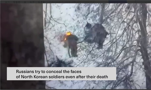 영상에는 "러시아는 북한 병사들이 죽은 뒤에도 얼굴을 감추려 하고 있다"는 영어 자막이 달렸다.