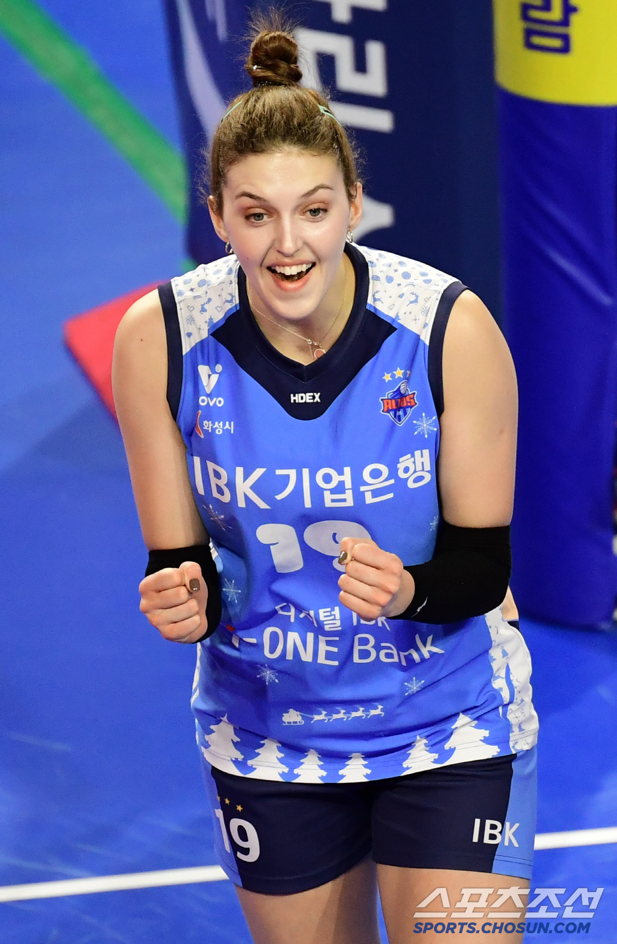 9일 화성 종합실내체육관에서 열린 배구 V리그 여자부 IBK기업은행과 페퍼저축은행의 경기. 3세트를 따낸 IBK 빅토리아가 동료들과 함께 기뻐하고 있다. 화성=송정헌 기자songs@sportschosun.com/2025.01.09/