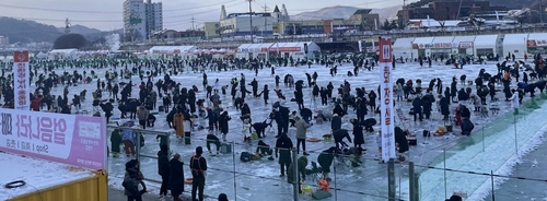 이른 아침부터 얼음낚시터 체험객 행렬…산천어 낚시 삼매경