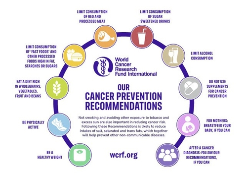 두 기관은 이 권고에서 ▲ 건강한 체중 유지 ▲ 지속적인 신체 활동 ▲ 통곡물, 야채, 과일 및 콩이 풍부한 식단 섭취 ▲ 지방, 전분, 설탕 함량이 높은 패스트푸드 및 기타 가공식품 섭취 제한 ▲ 붉은 고기 및 가공육 섭취 제한 ▲ 설탕이 많이 들어간 음료 섭취 제한 ▲ 알코올 섭취 제한 ▲ 암 예방을 위한 보충제 사용 금지 ▲ 가능하면 모유 수유하기 외에 마지막 10번째로 ▲ 암 진단 후에도 이들 권장 사항을 따를 것을 명시했다.