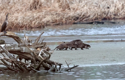 3마리 수달 가족이 모래톱 가까이 가자 휴식을 취하던 가마우지 무리와 오리들이 화들짝 놀라 날아갔다.