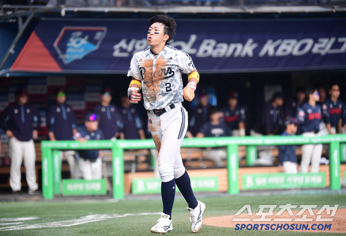 7일 잠실구장에서 열린 두산과 롯데의 경기. 4회말 2사 1루. 이유찬 2루타 때 득점에 성공한 두산 김민석. 잠실=송정헌 기자songs@sportschosun.com/2025.06.07/