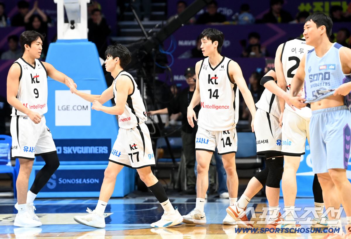 3일 고양소노아레나에서 열린 프로농구 고양 소노와 수원 KT의 경기. KT가 76대64로 승리하며 3연승을 달렸다. 승리가 확정되자 기뻐하는 KT 선수들의 모습. 고양=허상욱 기자wook@sportschosun.com/2026.01.03/
